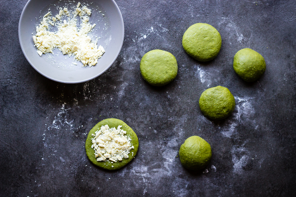 - Flatten each piece of dough into about a 4-5" circle & add 15g of chopped white chocolate to the flattened dough, pressing the chocolate into the dough. Fold the dough up & around the white chocolate, pressing the dough together to ensure it is well sealed