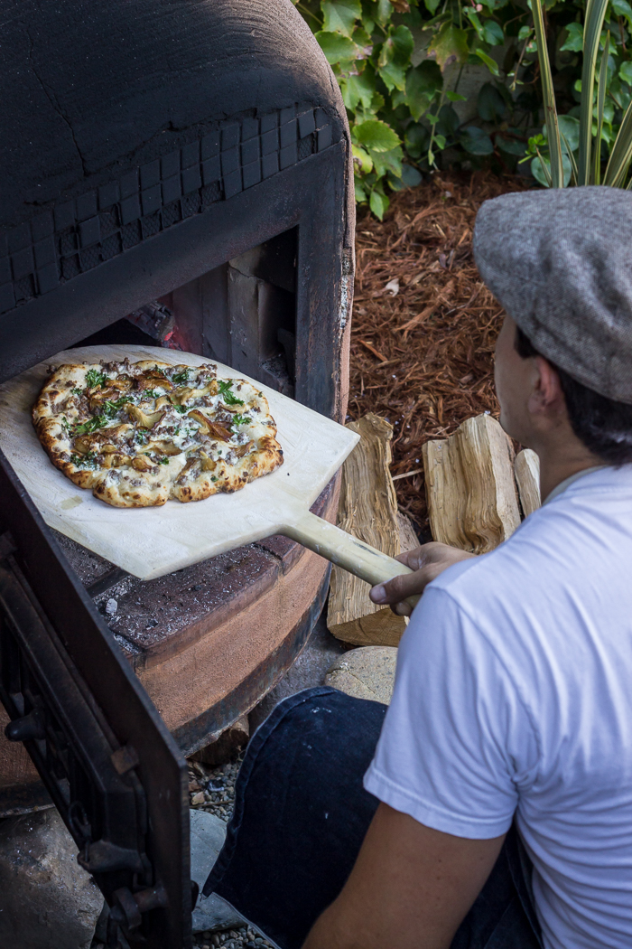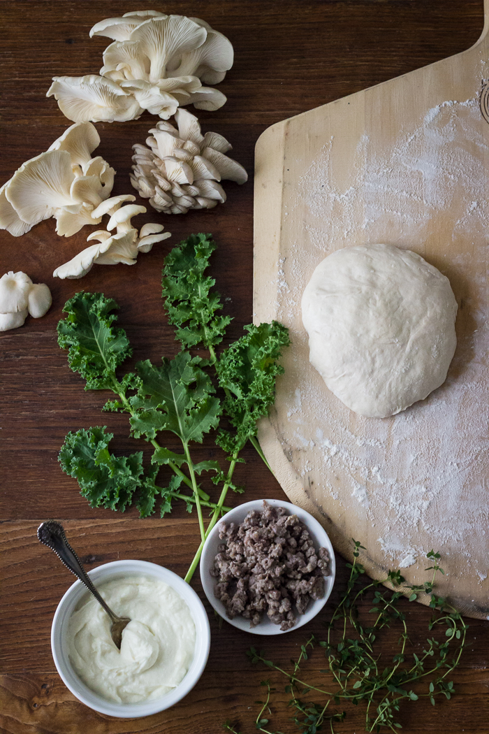 oyster mushroom + wild boar sausage + kale + garlic sauce flatbread